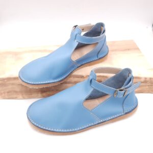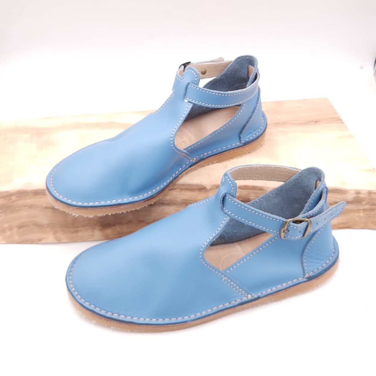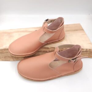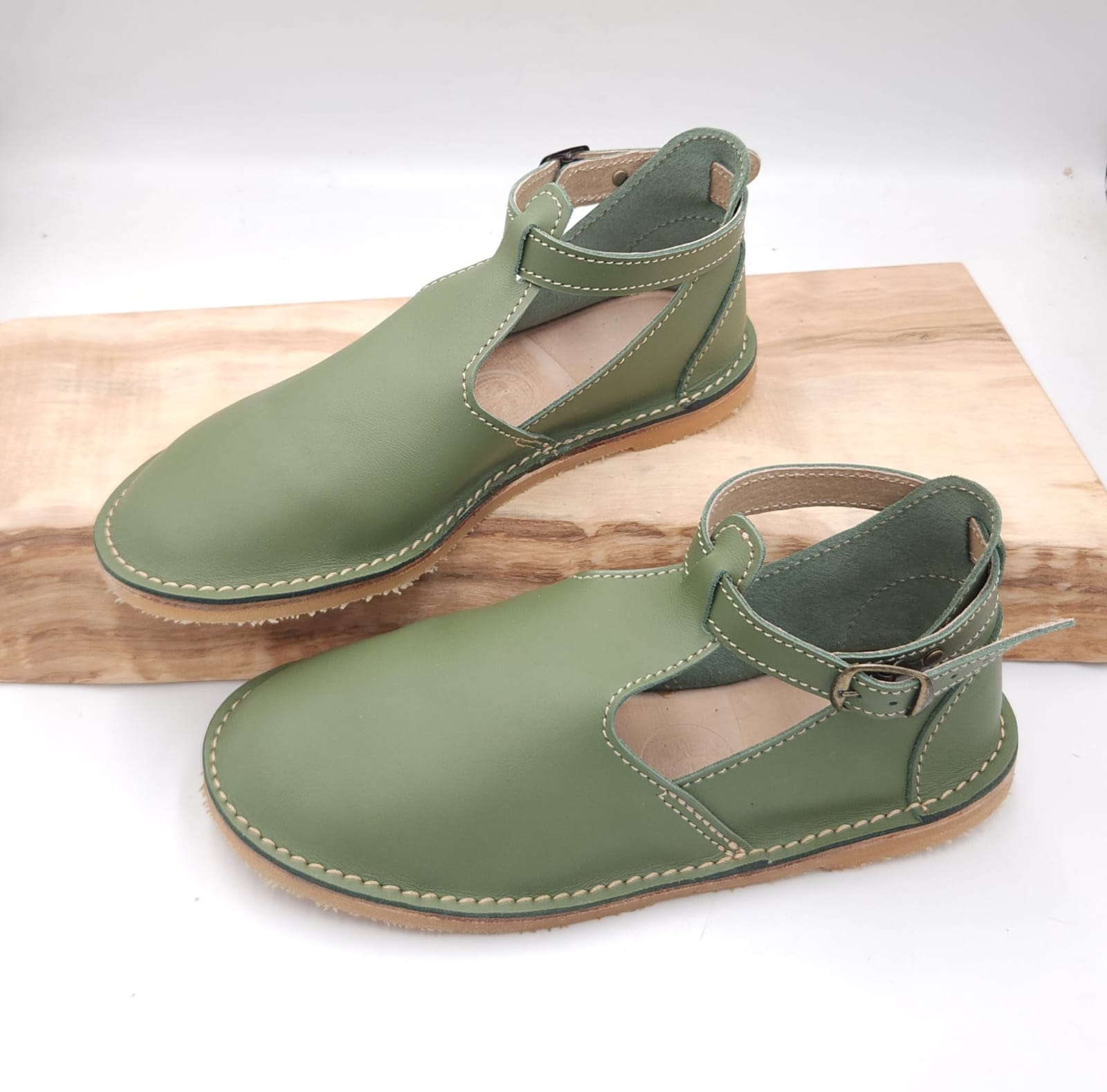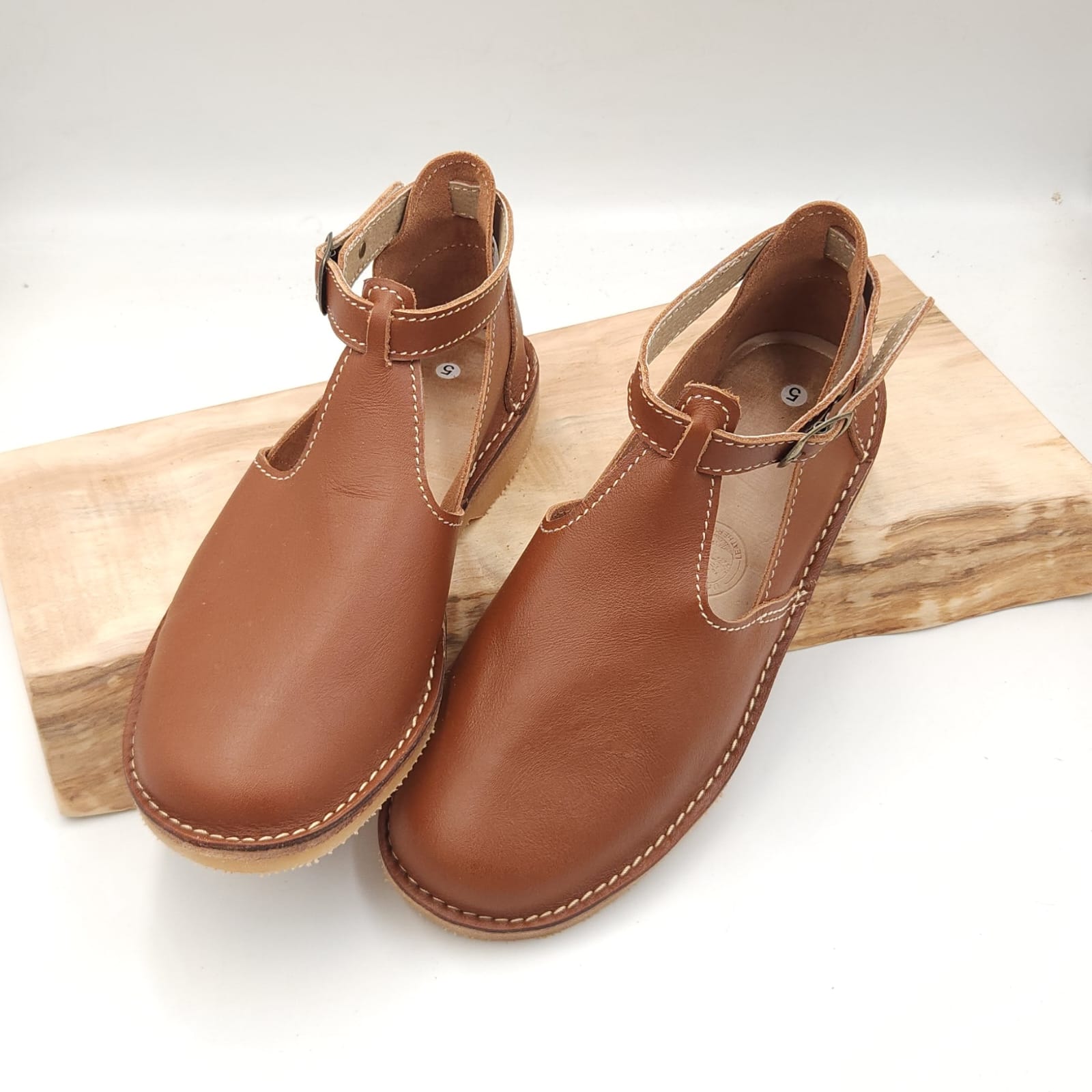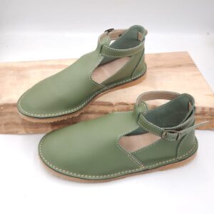 Sagte, duursame bees leer vellies met n bandjie om die enkel wat vasmaak met n gespe. Egte leer binnesole wat nie jou voete laat sweet en ruik nie.